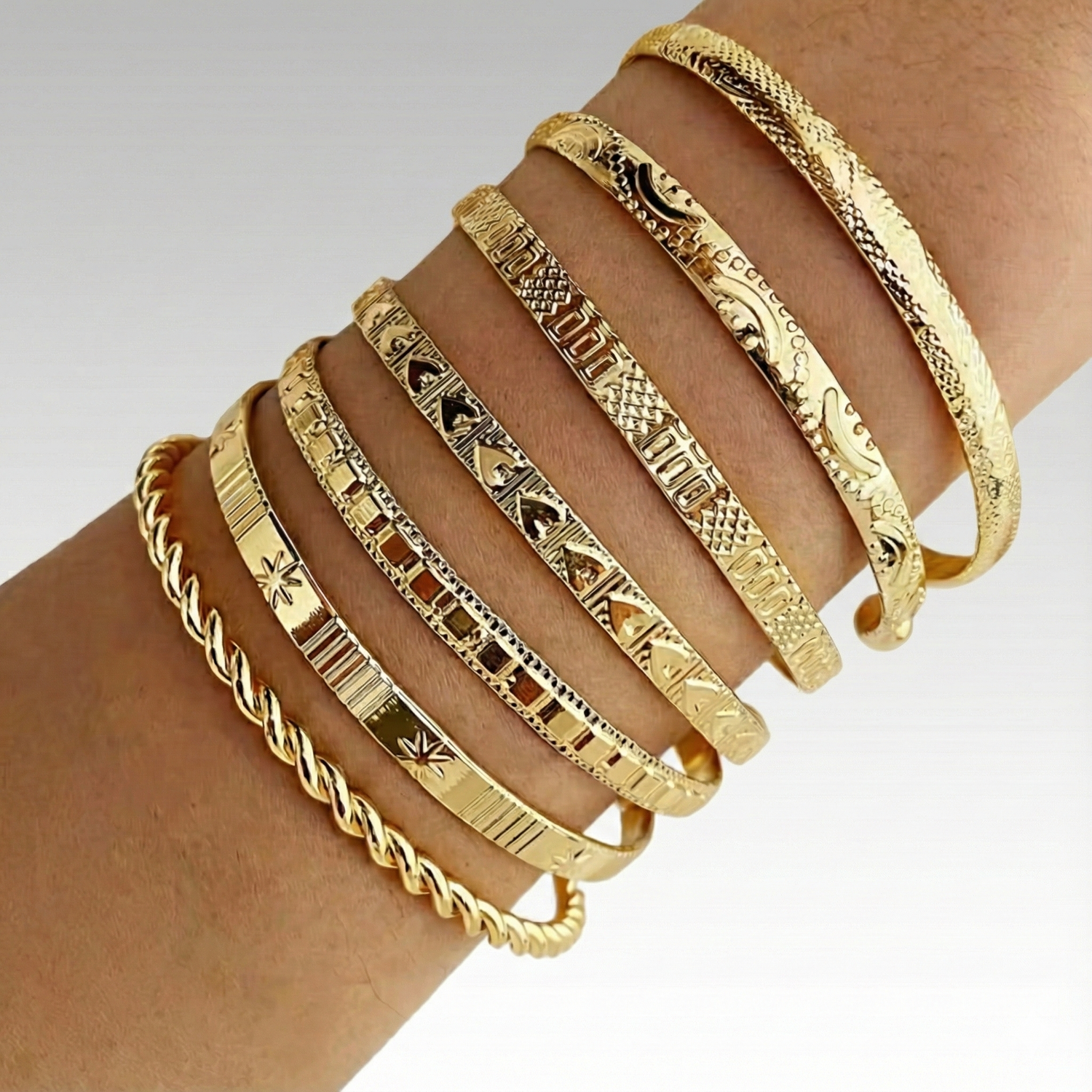 "These bangles have a genuine weight to them so they don't feel flimsy at all. The gold tone is a perfect, warm shade that matches my real 14k rings perfectly, not that fake yellow color you see elsewhere. I’ve worn them every day for two weeks and they still look brand new."
