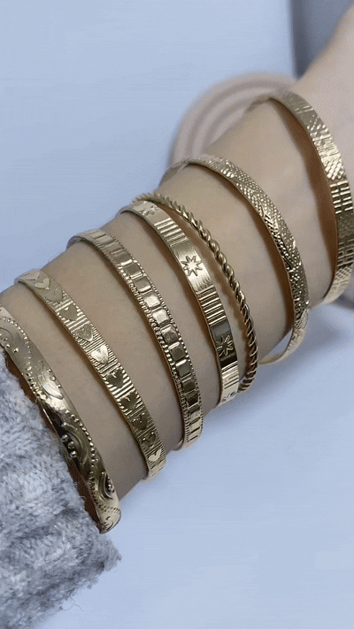 Inspired by vintage heirloom jewelry, each bangle features its own unique personality. With intricate etchings of celestial stars, geometric diamonds, and classic rope twists, this stack offers a depth of texture you simply can't find in standard plain cuffs.